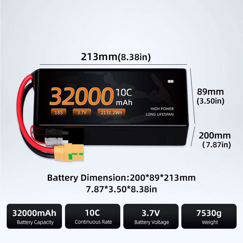 | 30000mAh 6S 22.2V 5C Ρυθμός εκφόρτισης: 5C/10C Τάση: 22.2V Διαστάσεις: 59*87*195mm Βάρος: 2216g Συνδετήρες: XT90-S/XT60/EC5 κ.λπ. |